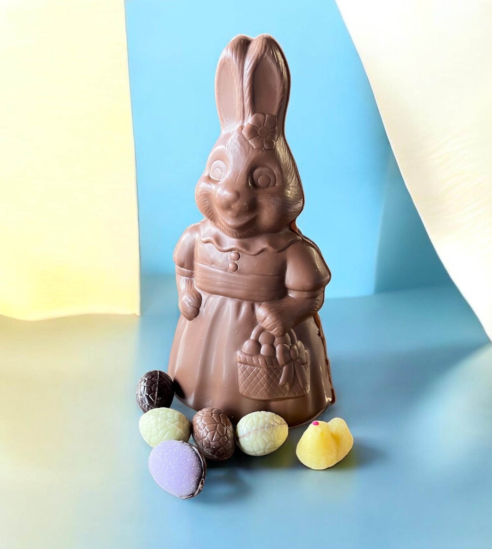 Holfiguur haas meisje + snoepeitjes + suikerkipje